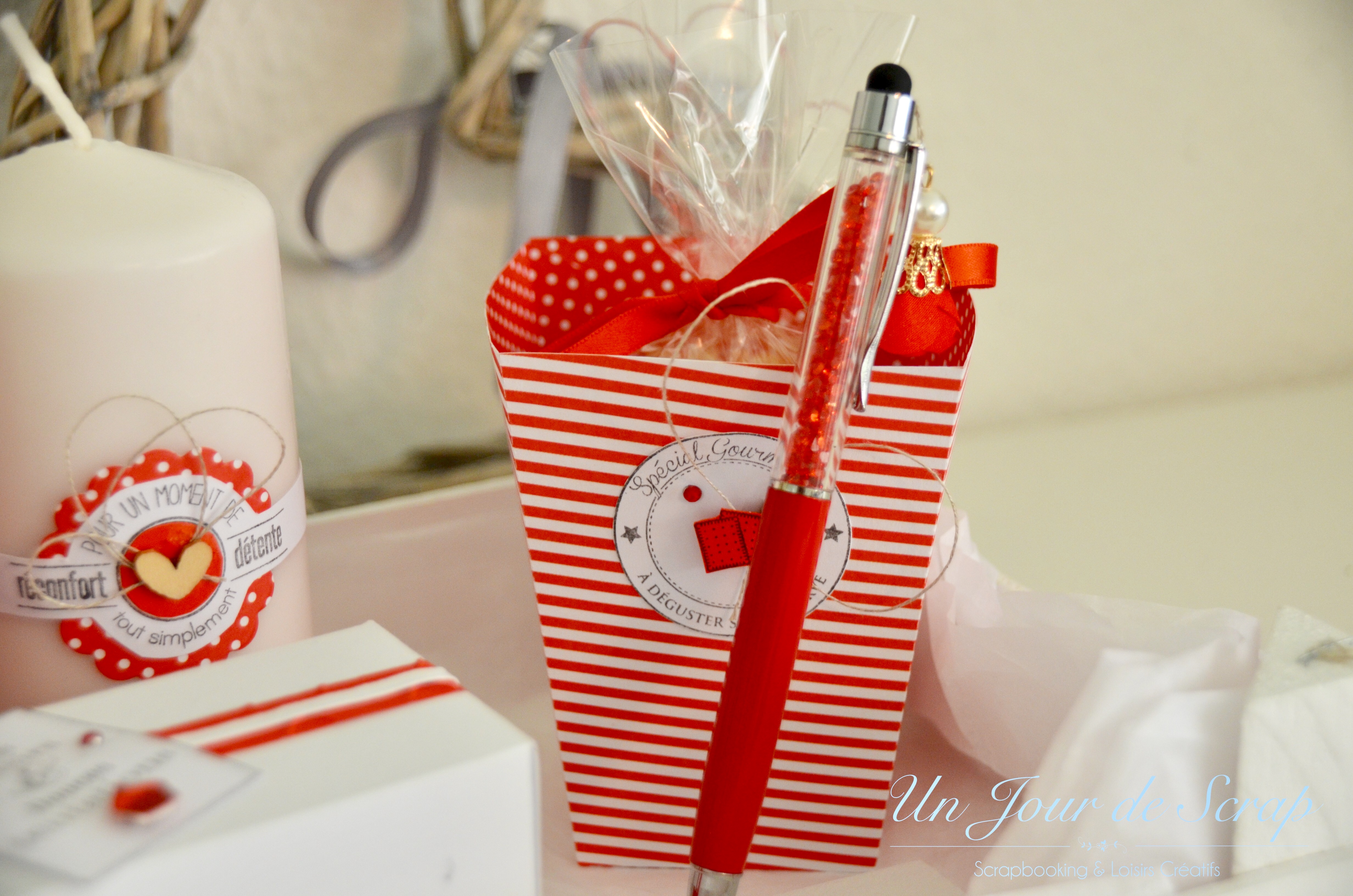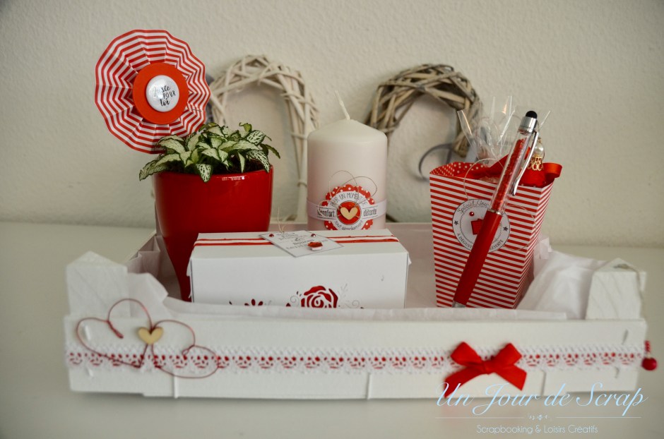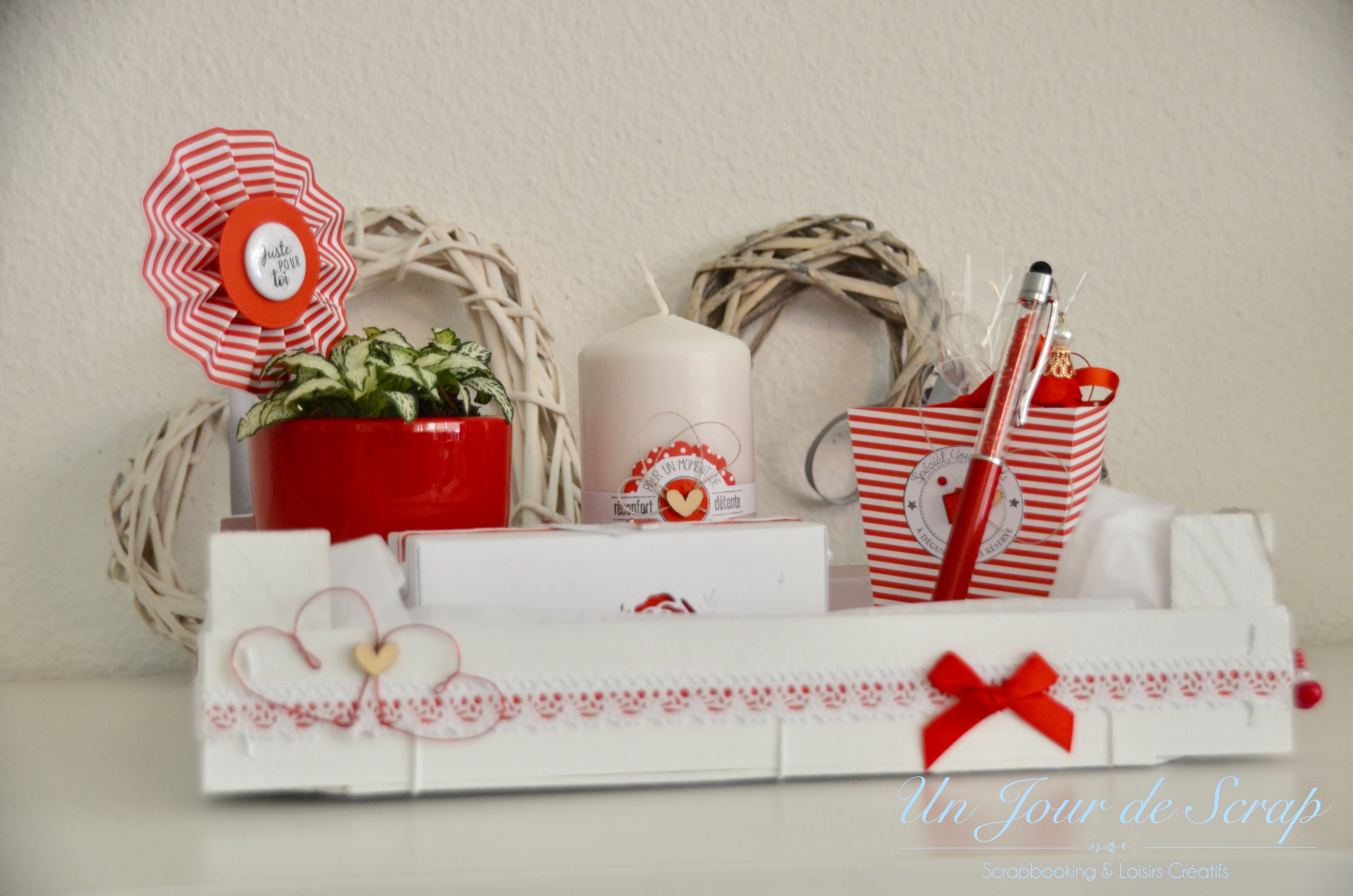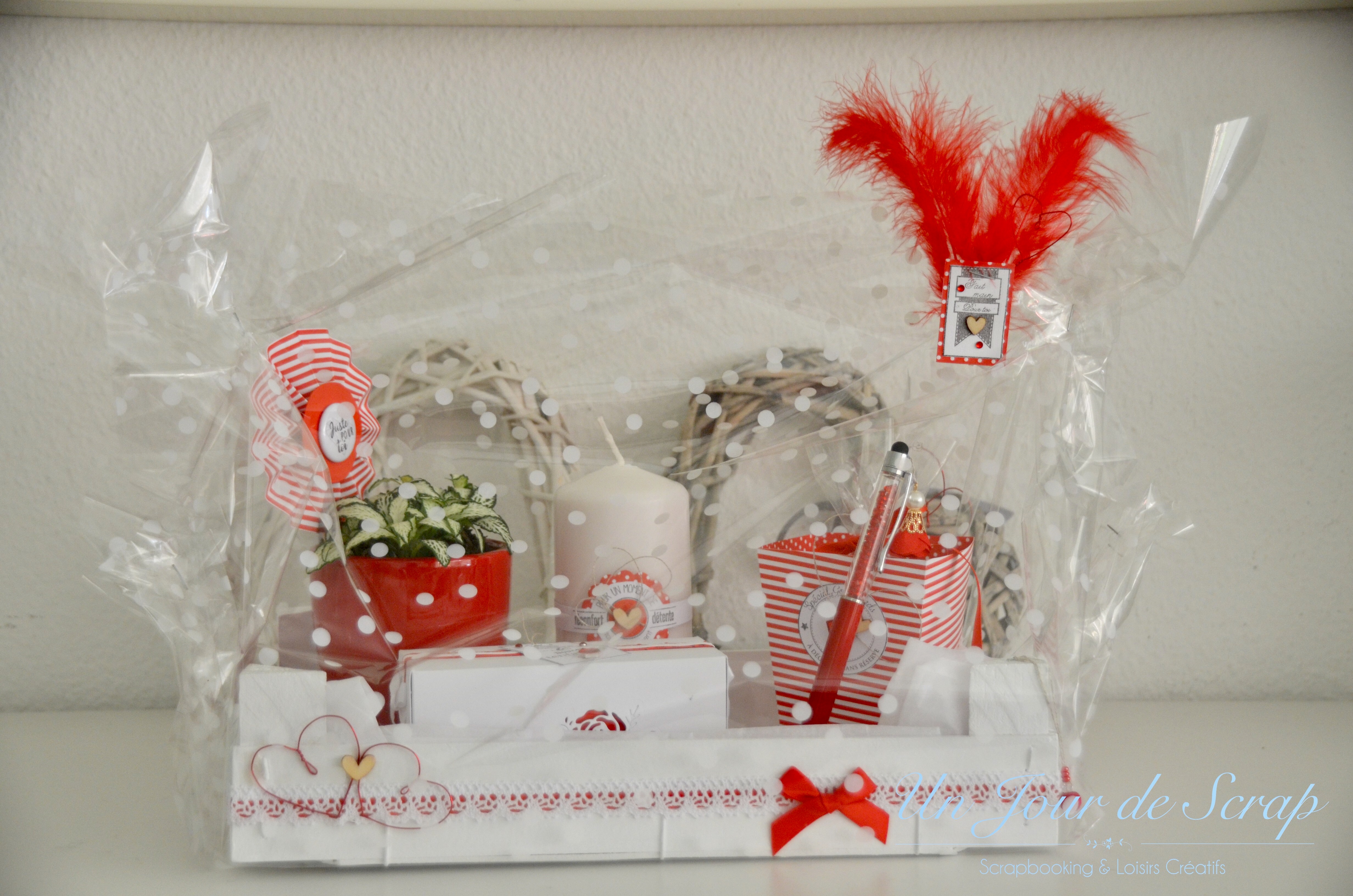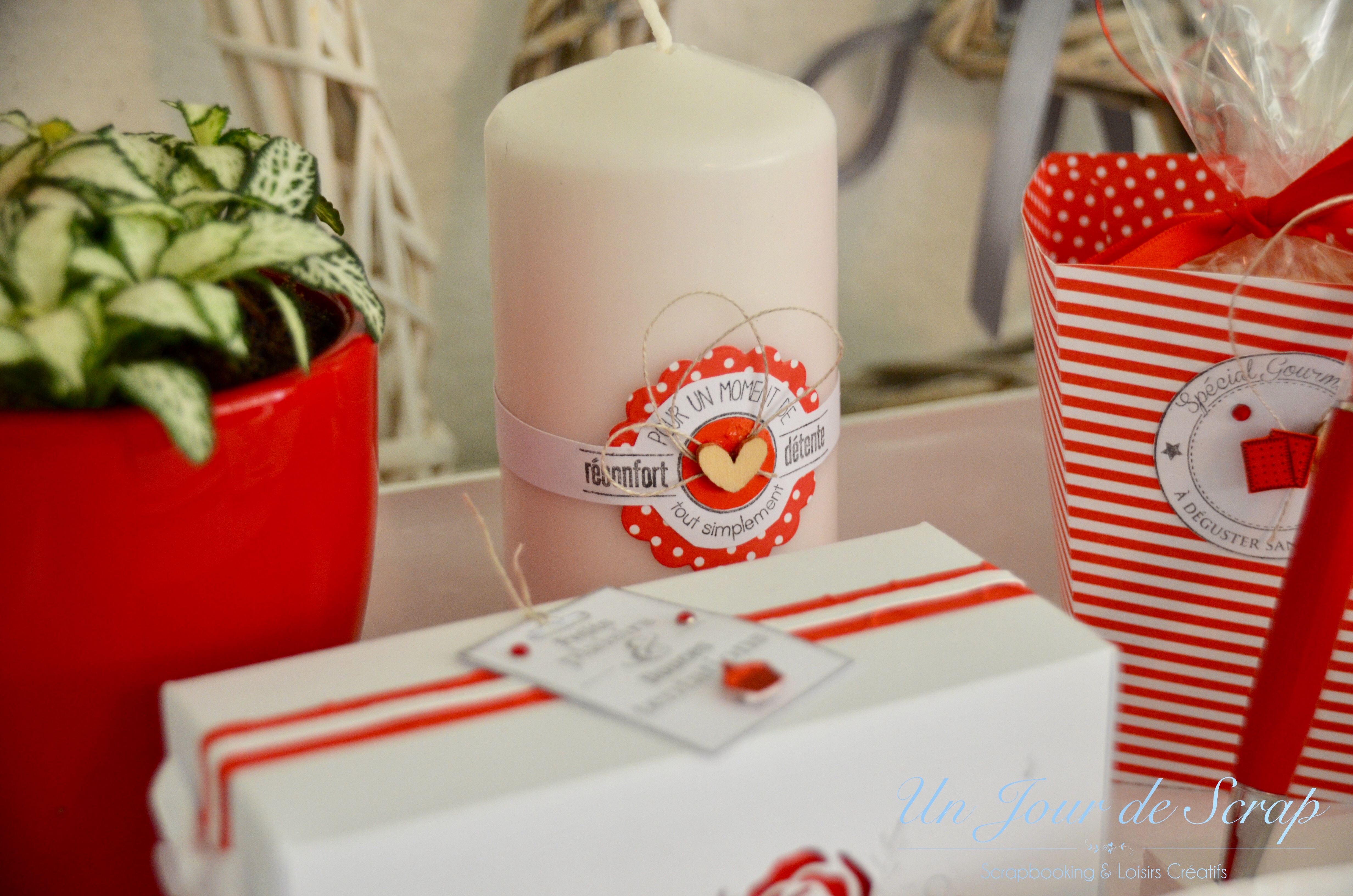 Cette semaine je vous dévoile un panier cadeau de départ pour une de mes collègues. J’ai réalisé une version rouge et une version verte (que vous verrez dans un prochain article). Je n’ai pas l’habitude d’utiliser cette couleur mais je dois avouer que le rendu me plait beaucoup. Les tampons viennent de chez Florilèges Design. Il y a une bougie, un stylo, une plante, une boîte avec des petits gâteaux maisons dedans et une boîte avec du pop corn à faire cuire! n’hésitez pas à liker ou partager! Voici l’aperçu: