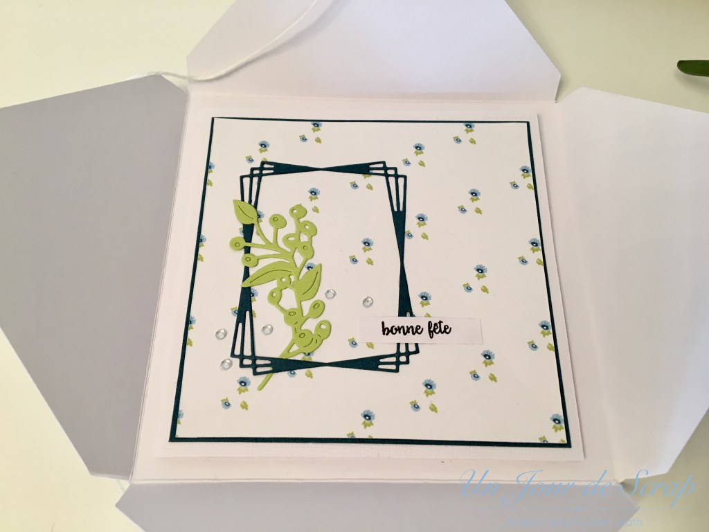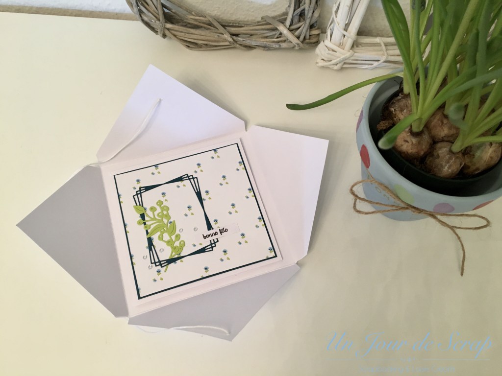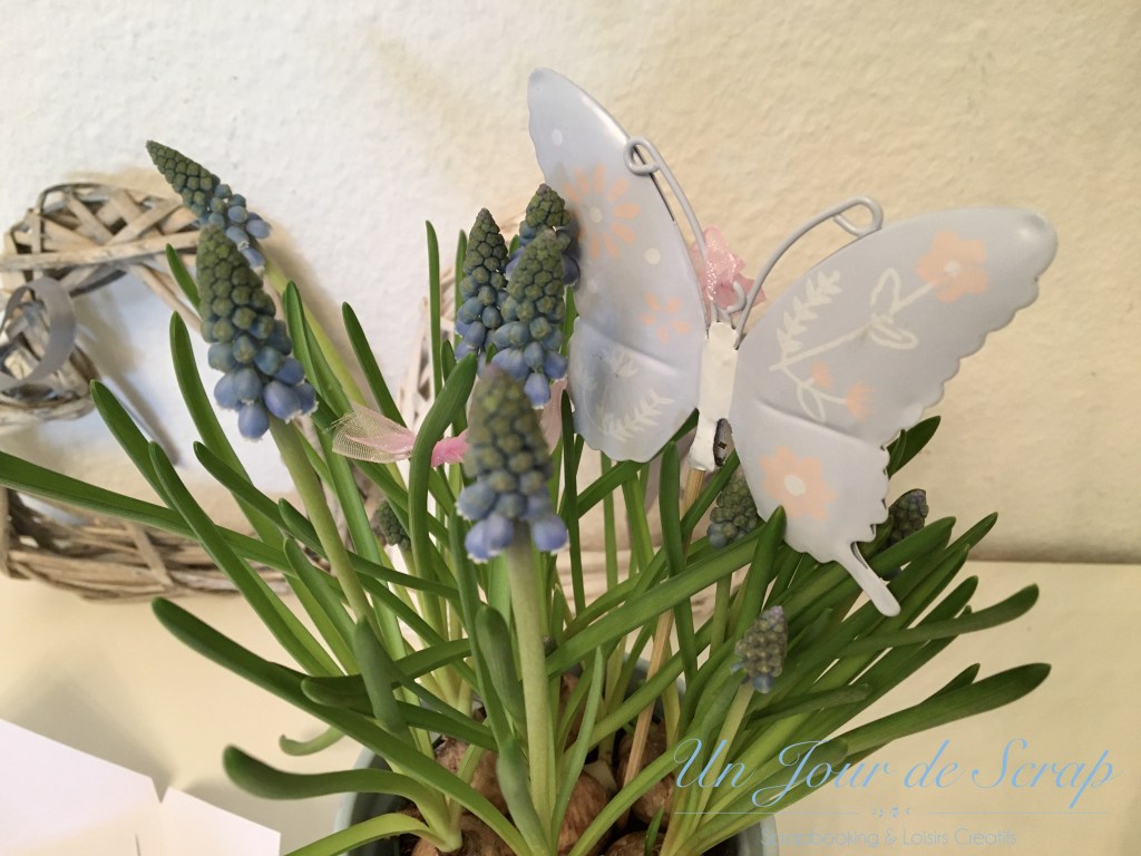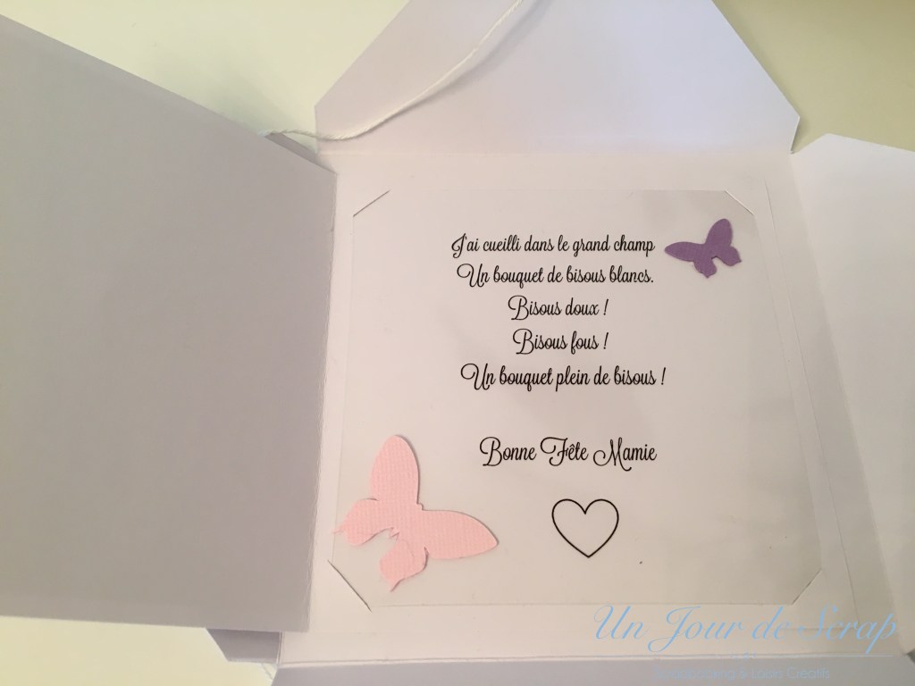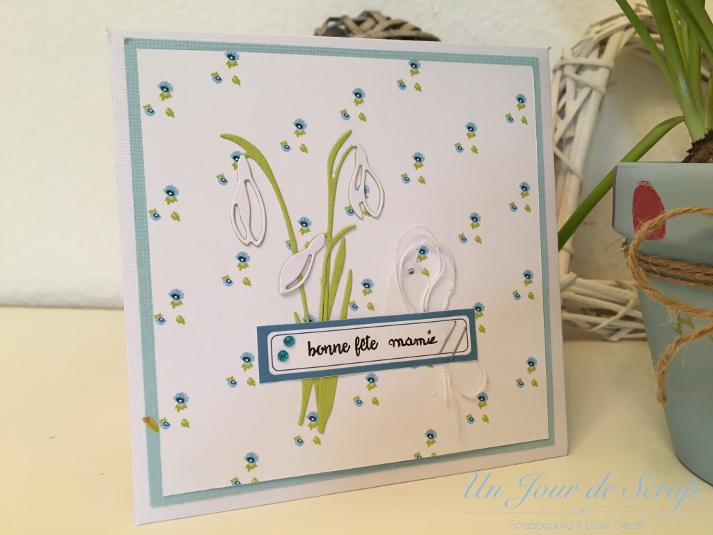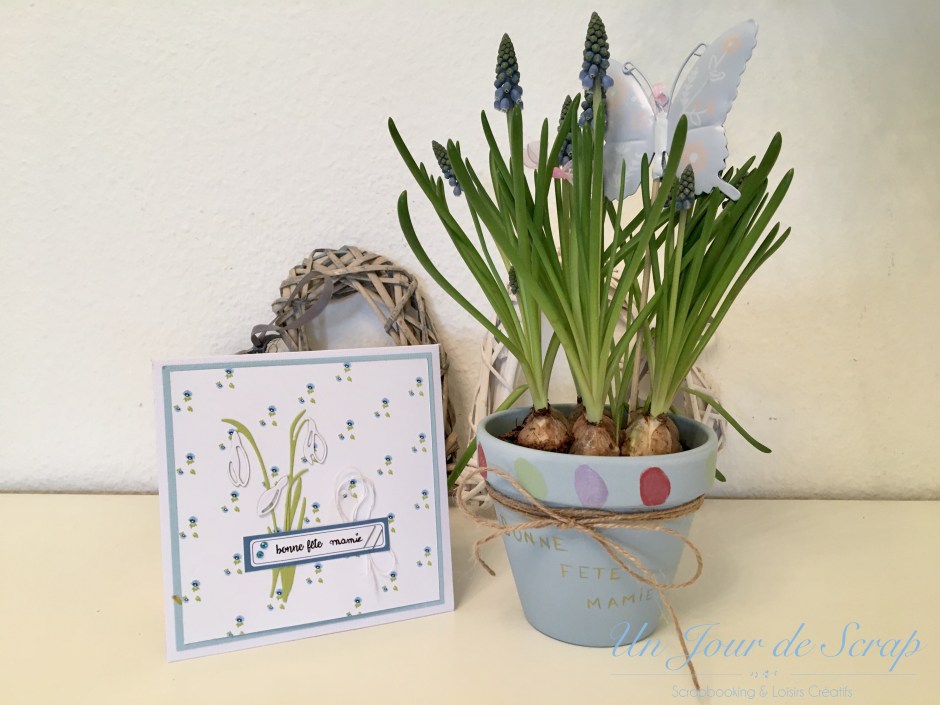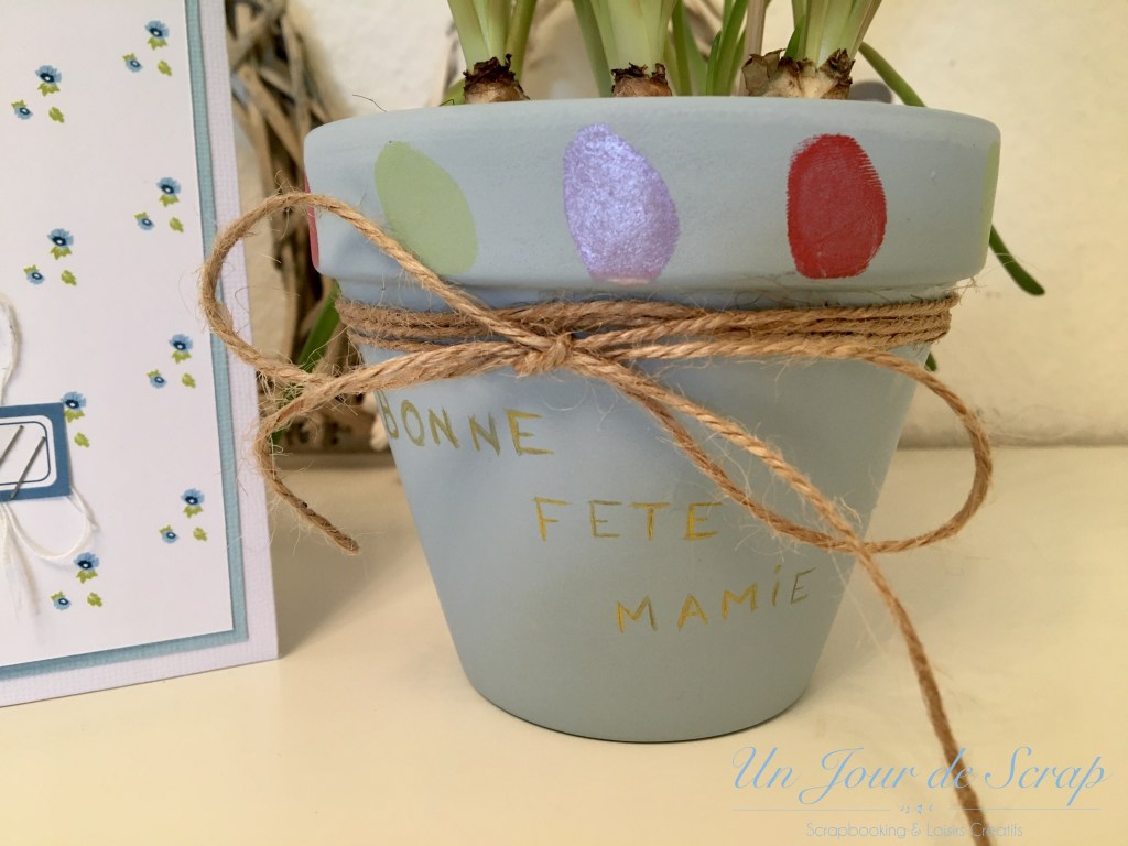 Aujourd’hui c’est la fête des Grands-Mères et pour une fois j’y ai pensé un peu en avance…Du coup j’ai eu le temps de préparer une petite surprise pour ma maman de la part d’Aiden. J’ai sprayé un pot de fleur avec le spray Chalky Finish bleu de Rahyer et j’ai tamponné avec mes tampons scrap les empreintes d’Aiden tout autour du pot. C’était très amusant à faire avec lui, il a beaucoup aimé. J’ai utilisé les tampons Versamagic car ils sont très faciles à nettoyer sur la peau. Une petite ficelle et j’ai écrit au stylo or Bonne fête Mamie. Pour la carte, elle a été réalisé selon le tuto de ChristineB sur le forum 4enscrap, et je ne peux que vous conseiller d’aller faire un tour sur le forum pour voir les versions de chacune!!