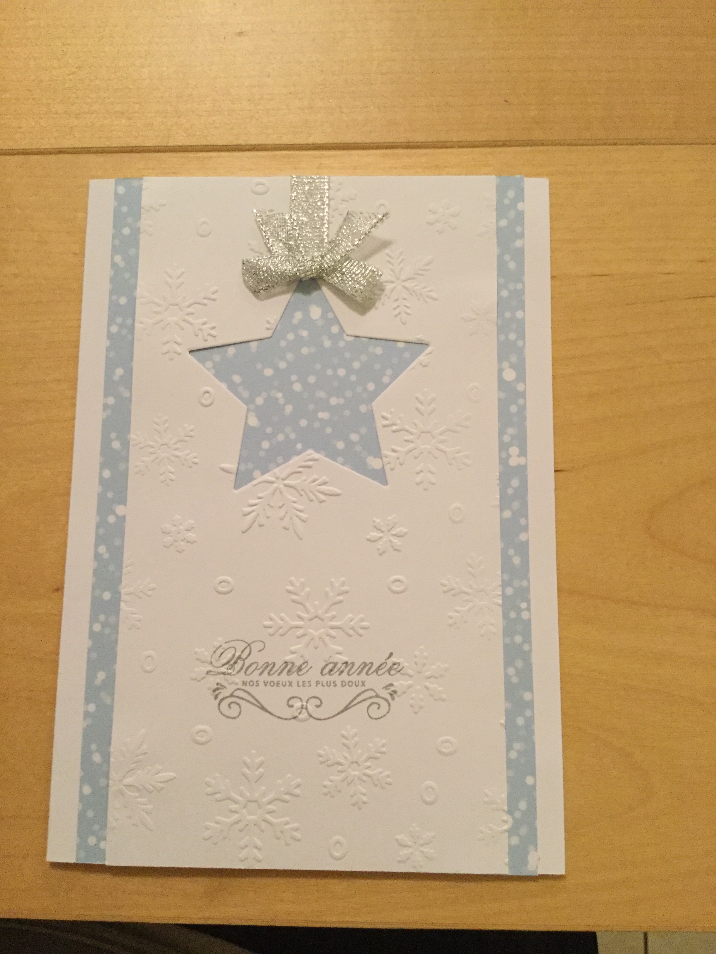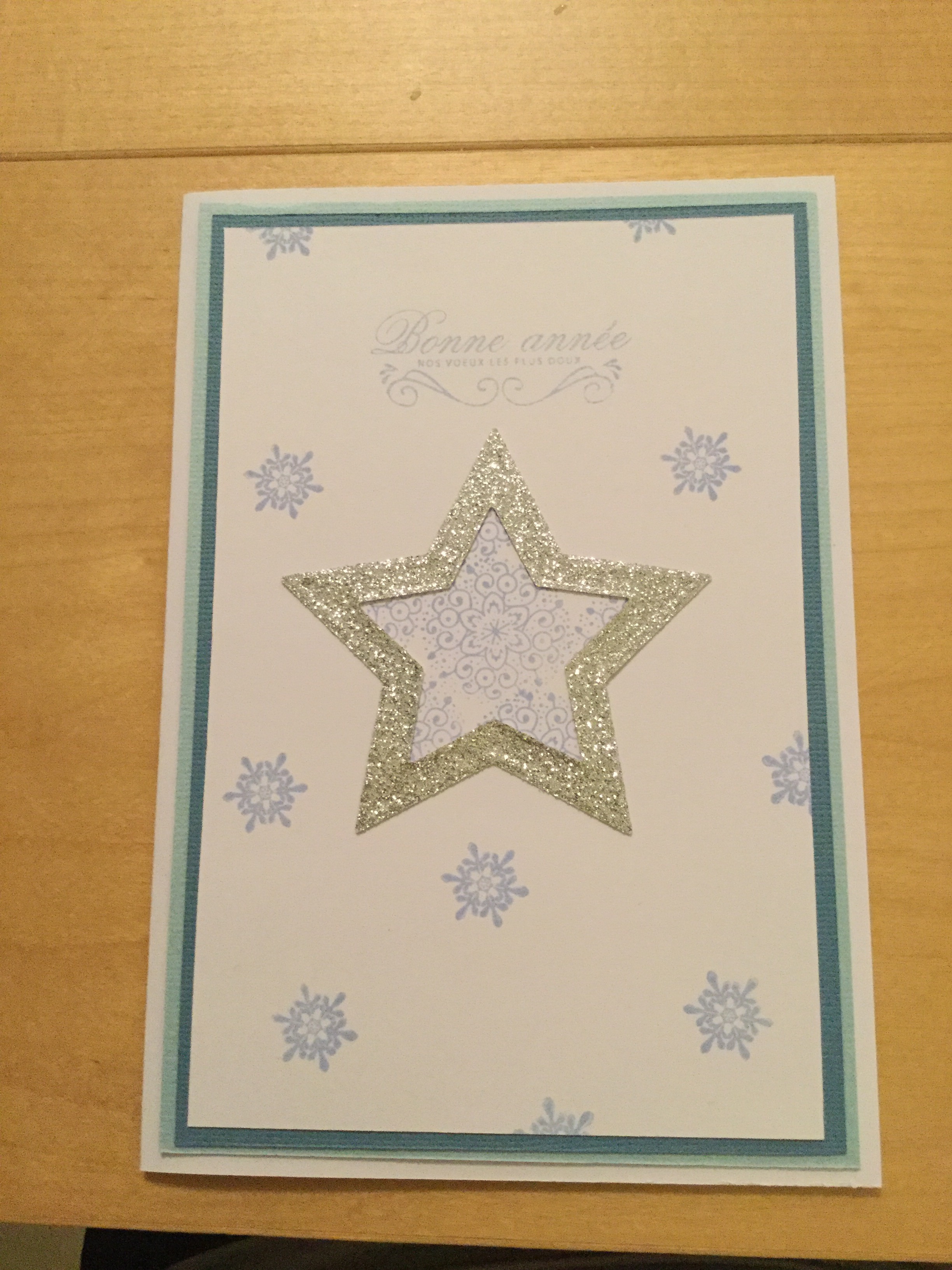 Noël approche à grand pas. J’ai bien avancé dans mes cartes de vœux. En voici d’ailleurs un exemple sur le thème étoile et flocon. Du papier pailleté pour donner un petit air de fête!