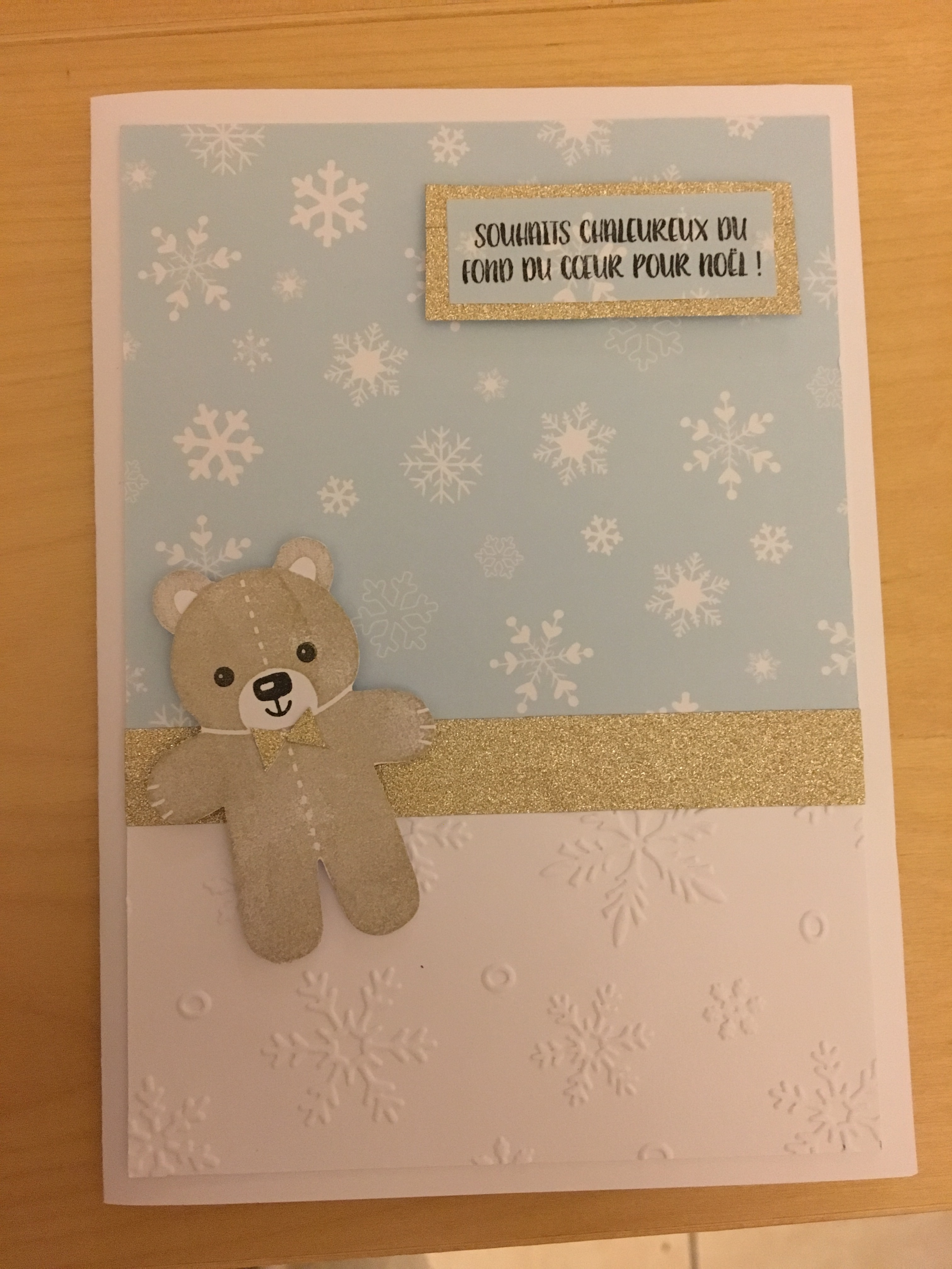 Cette semaine, une carte simple pour Noël. Le tampon ourson vient de Stampin Up. Quelques flocons par ci par là…Et voilà!