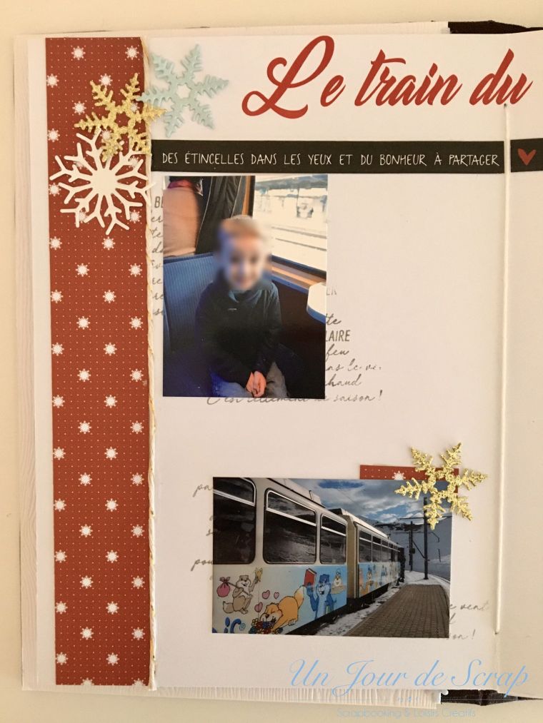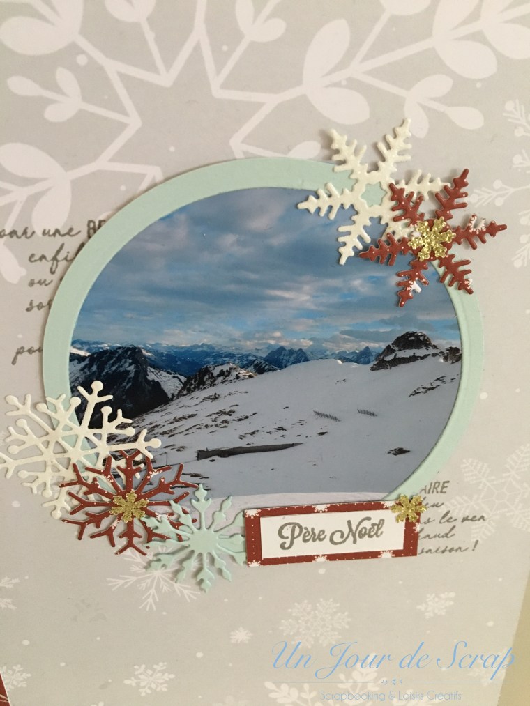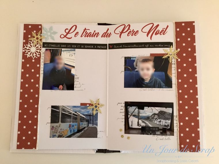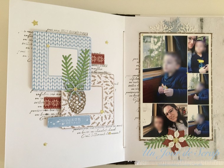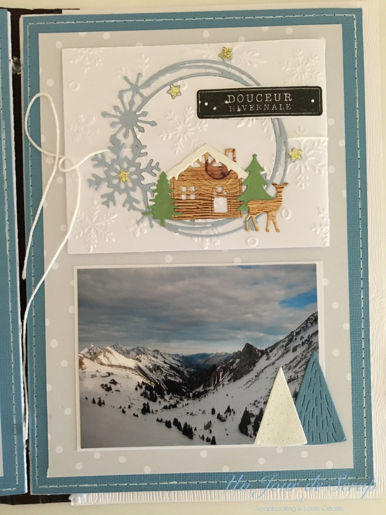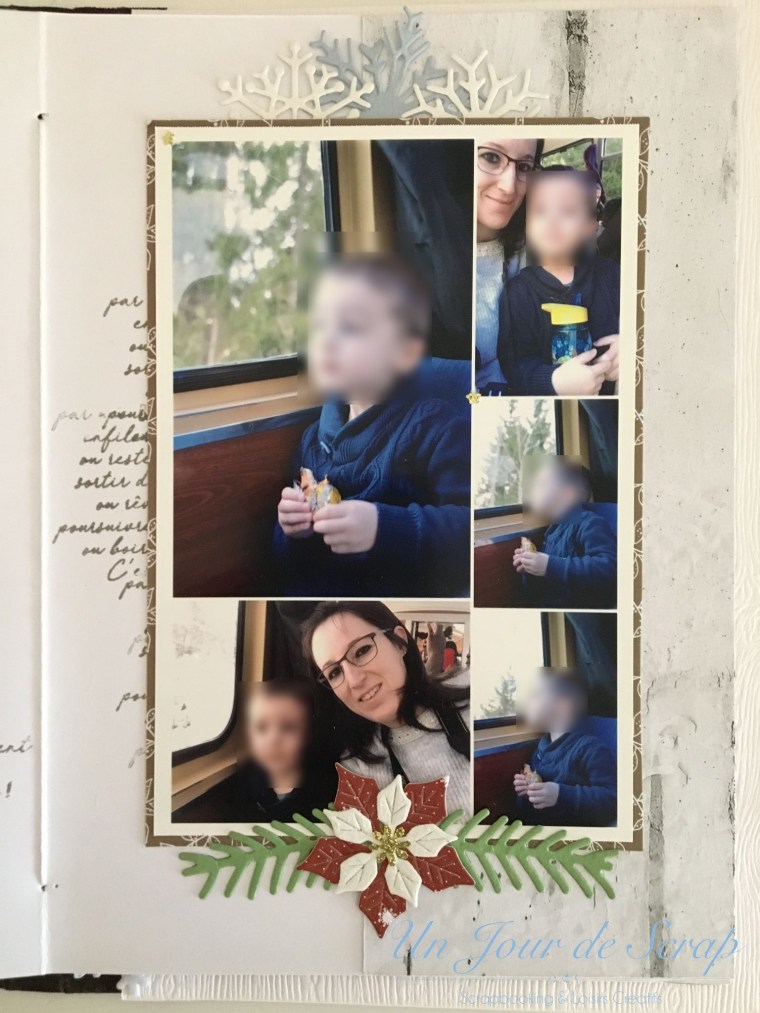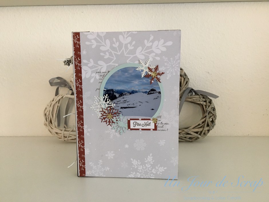 En décembre avec mon fils nous avons pris le train à crémaillère pour aller voir le village du Père Noël au Rocher de Naye (au-dessus de Montreux). Nous avons eu beaucoup de chance il faisait très beau et rien que pour la vue cela vaut le coup de monter là haut! C’est sur nous y retournerons en été. Aiden a pu ainsi faire une photo avec le Père Noël et maman (parce que le Père Noël c’est pas très rassurant…:-)) Très bonne excuse donc pour faire un mini album souvenirs! J’ai principalement utilisé la marque Florilèges Design mais il y a aussi les magnifiques flocons de Simply Graphic et quelques dies de 4en scrap que j’adore!