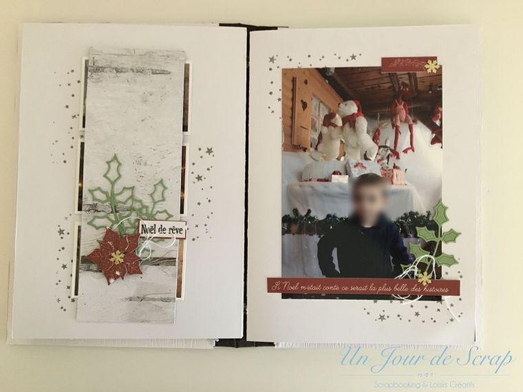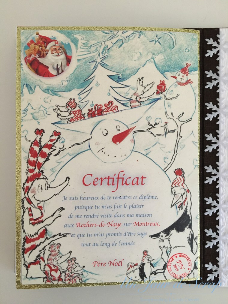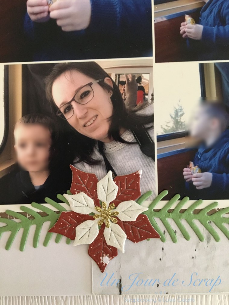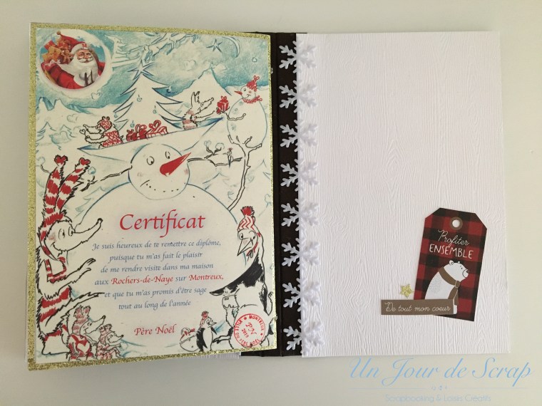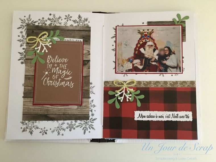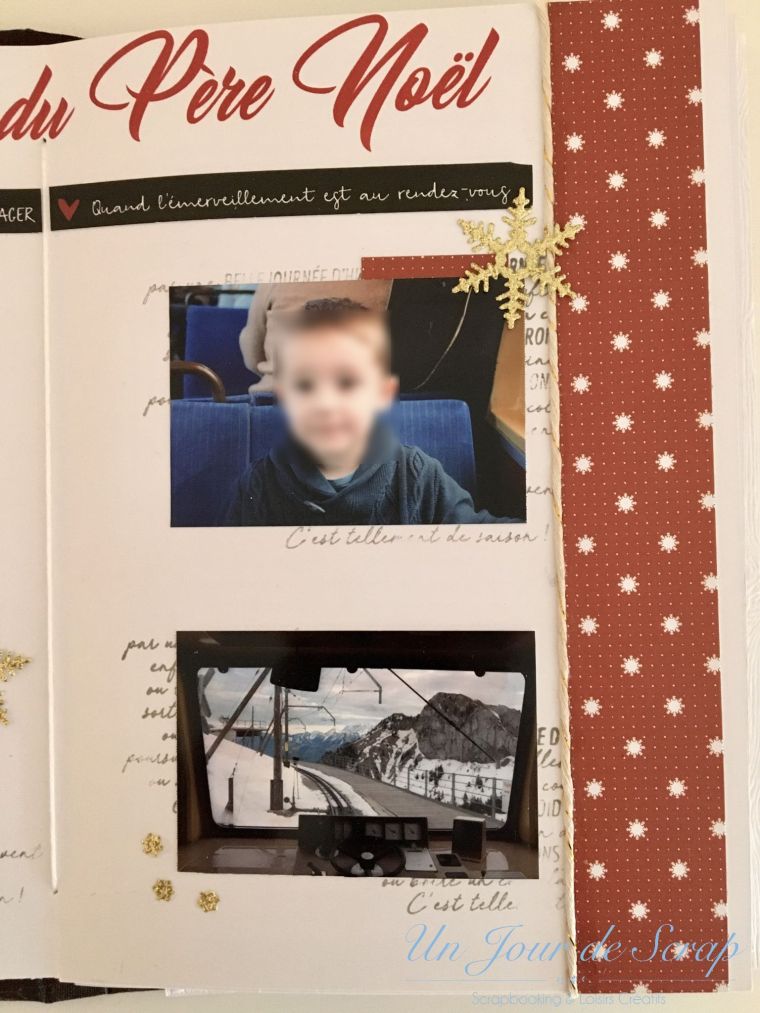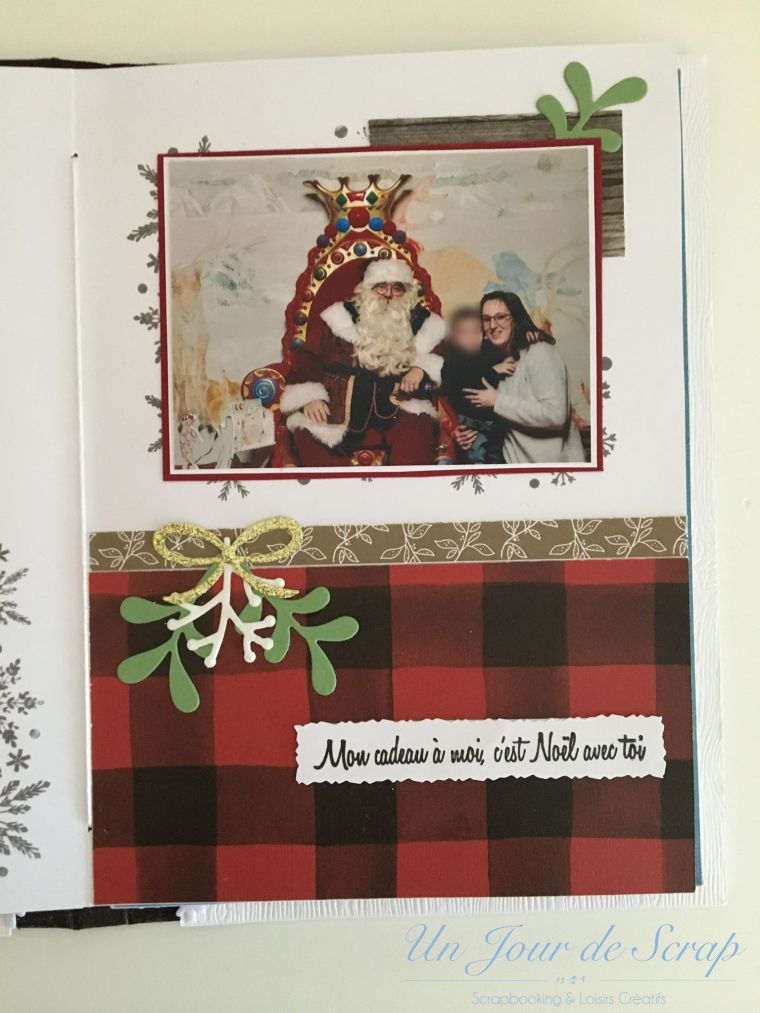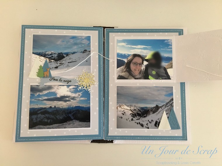 En décembre avec mon fils nous avons pris le train à crémaillère pour aller voir le village du Père Noël au Rocher de Naye (au-dessus de Montreux). Nous avons eu beaucoup de chance il faisait très beau et rien que pour la vue cela vaut le coup de monter là haut! C’est sur nous y retournerons en été. Aiden a pu ainsi faire une photo avec le Père Noël et maman (parce que le Père Noël c’est pas très rassurant…:-)) Très bonne excuse donc pour faire un mini album souvenirs! J’ai principalement utilisé la marque Florilèges Design mais il y a aussi les magnifiques flocons de Simply Graphic et quelques dies de 4en scrap que j’adore!