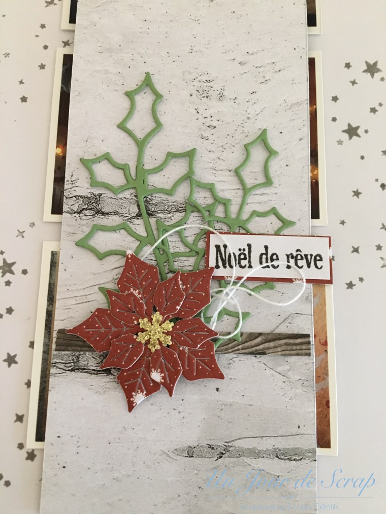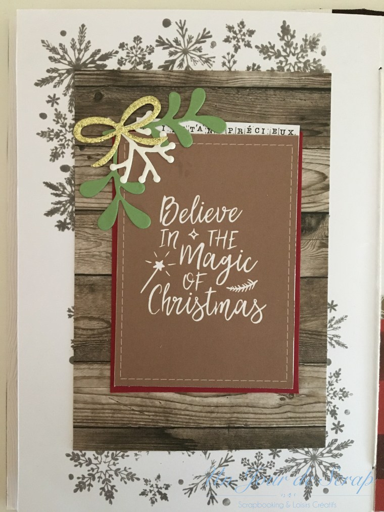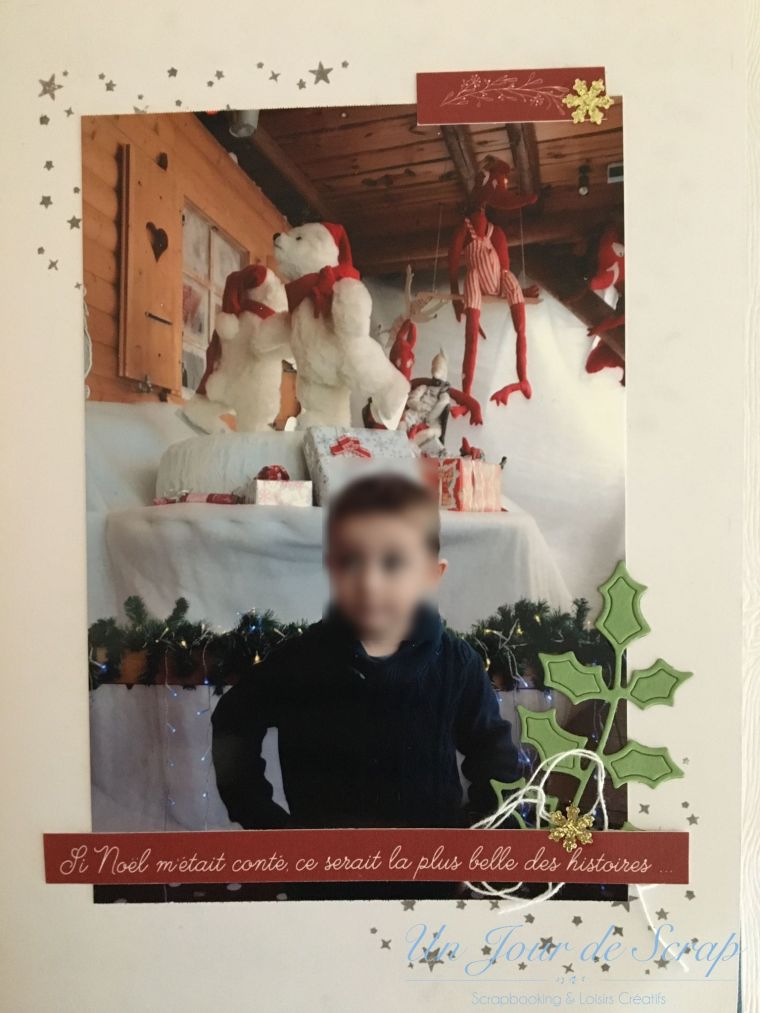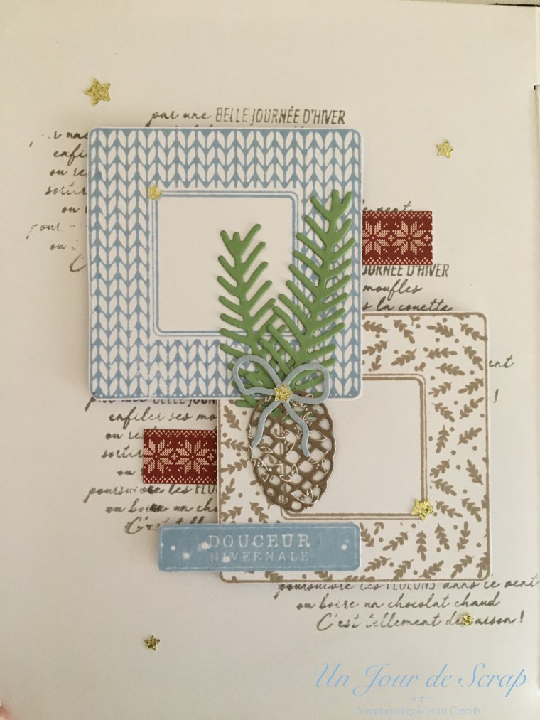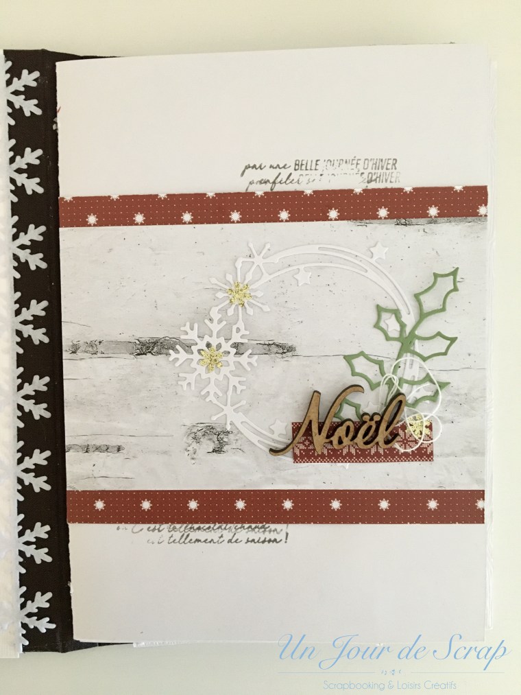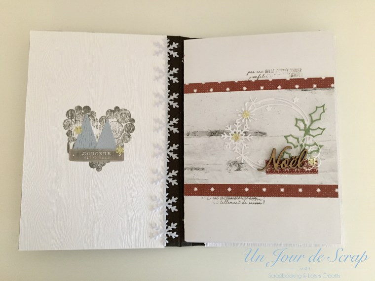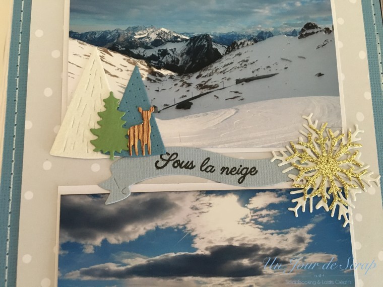 En décembre avec mon fils nous avons pris le train à crémaillère pour aller voir le village du Père Noël au Rocher de Naye (au-dessus de Montreux). Nous avons eu beaucoup de chance il faisait très beau et rien que pour la vue cela vaut le coup de monter là haut! C’est sur nous y retournerons en été. Aiden a pu ainsi faire une photo avec le Père Noël et maman (parce que le Père Noël c’est pas très rassurant…:-)) Très bonne excuse donc pour faire un mini album souvenirs! J’ai principalement utilisé la marque Florilèges Design mais il y a aussi les magnifiques flocons de Simply Graphic et quelques dies de 4en scrap que j’adore!
