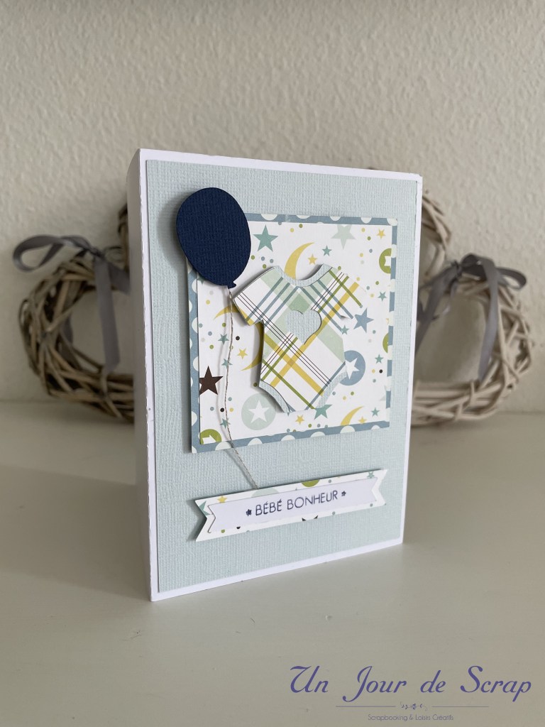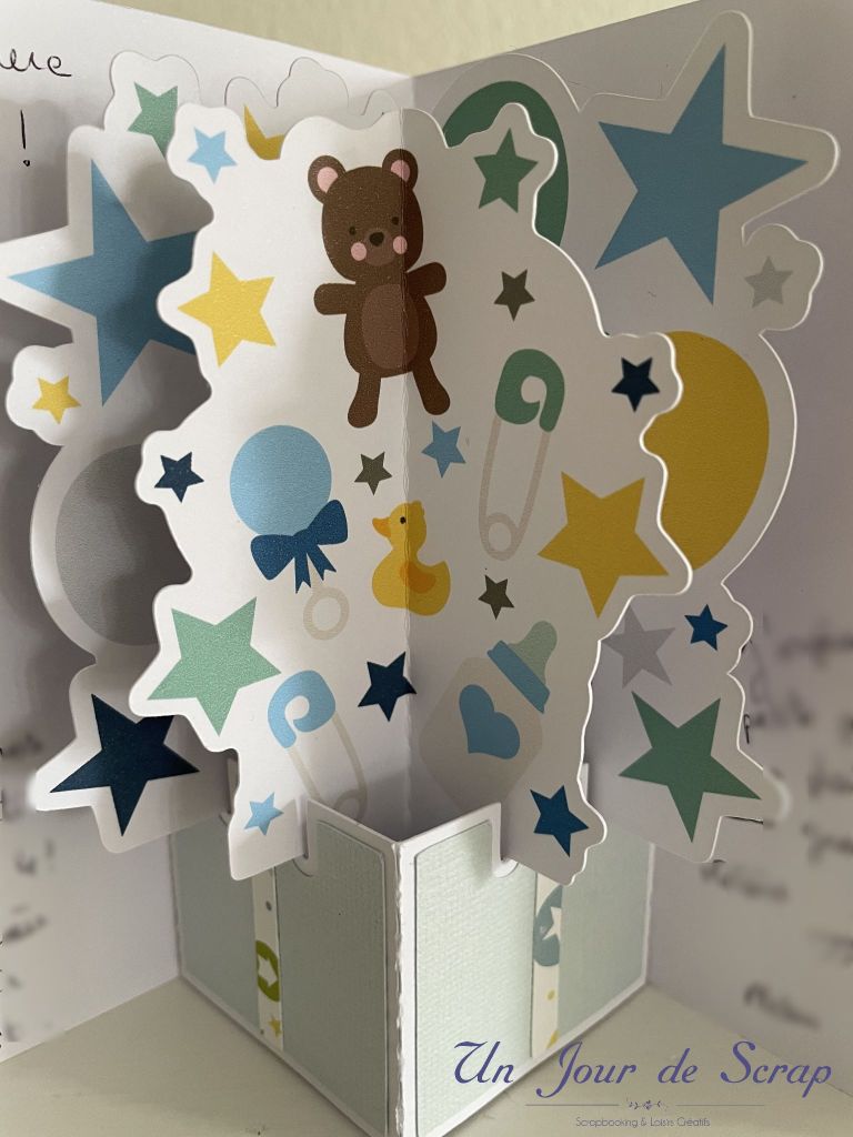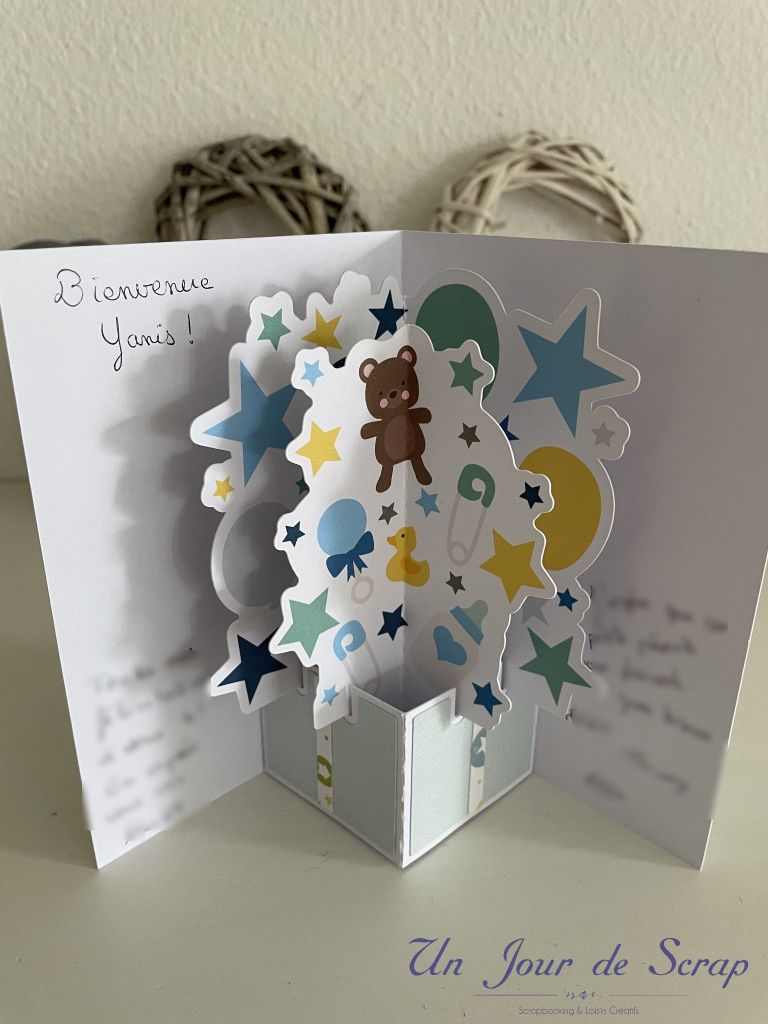 Une carte de bienvenue pop up réalisée grâce à la silhouette caméo. Je suis assez contente du résultat, c’était finalement plus simple que ce que je croyais et tout s’est bien « emboité »! Les papiers sont de la marque Echo Park, dont j’ai adoré les tons bleu, jaune, vert!