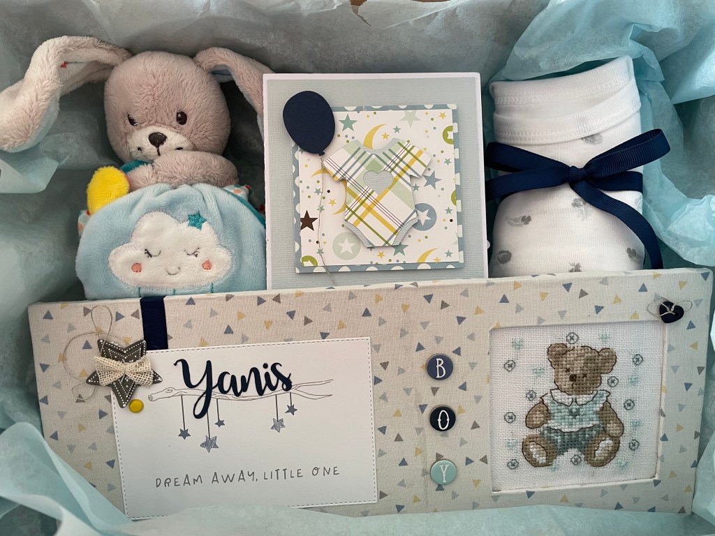 Je vous montre aujourd’hui un « carton » cadeau de bienvenue pour un petit Yanis. Dans ce carton, j’ai glissé plusieurs petits cadeaux:
